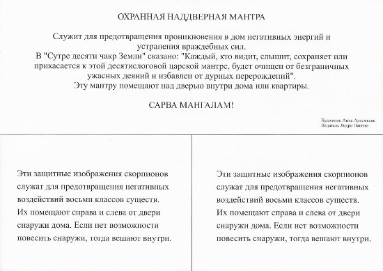 Изображение необходимо разрезать на три части: мантру отдельно, скорпионов отдельно. Скорпионов надо повесить головой к двери, хвостами вверх на уровне живота или сердца.